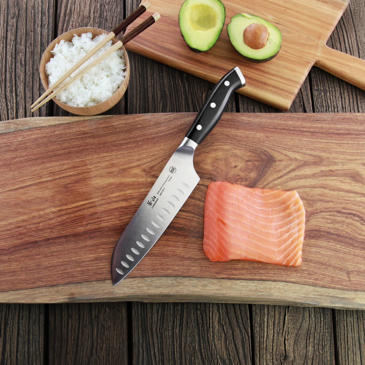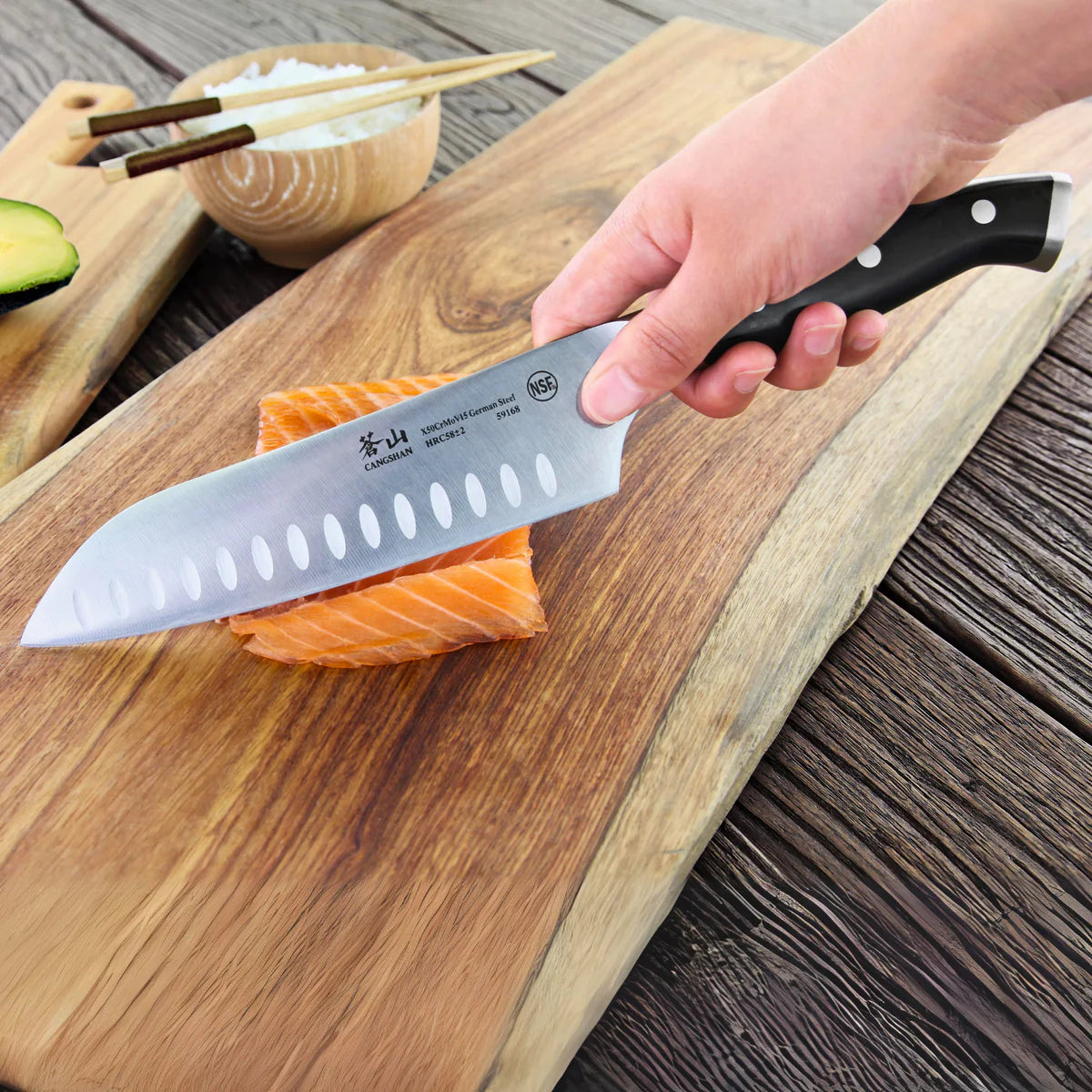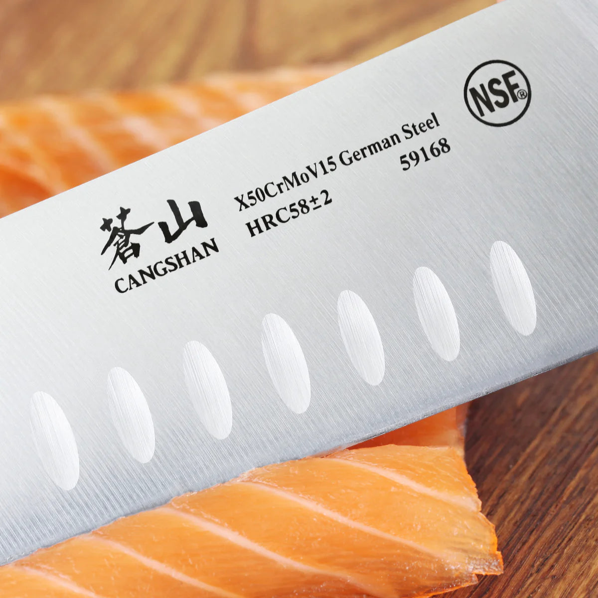 This Santoku knife can be used for mincing, slicing, chopping vegetables, slicing meat, and disjointing large cuts. Works well for heavy kitchen use.