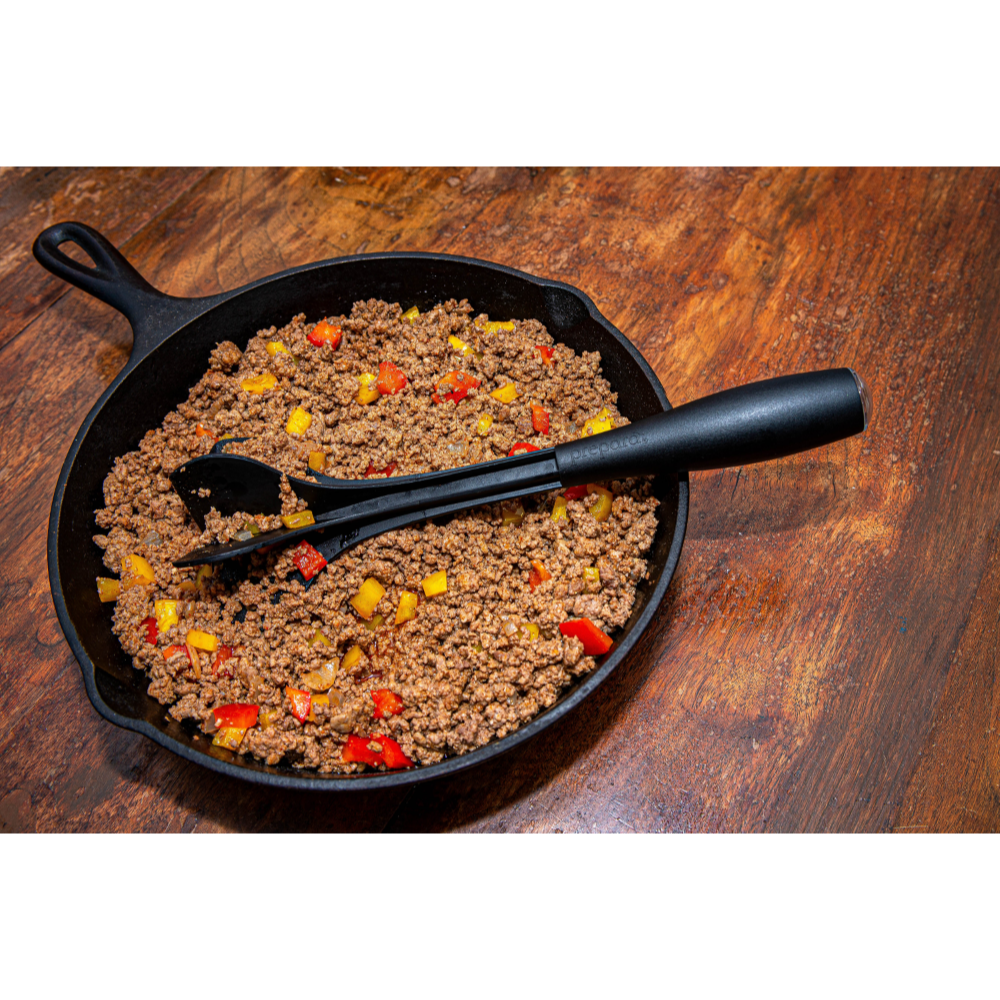 The Chop Turner combines the functions of a spatula and meat chopper so you can chop, flip, and turn while browning meat, all with one handy tool. Designed with an elevating foot to keep the dirty head off of the counter top, and a decorative end cap to allow for color and style variations, this high temperature resistant tool gets the job done. Practical and pretty. Works well with all meats, tofu, meat substitutes.