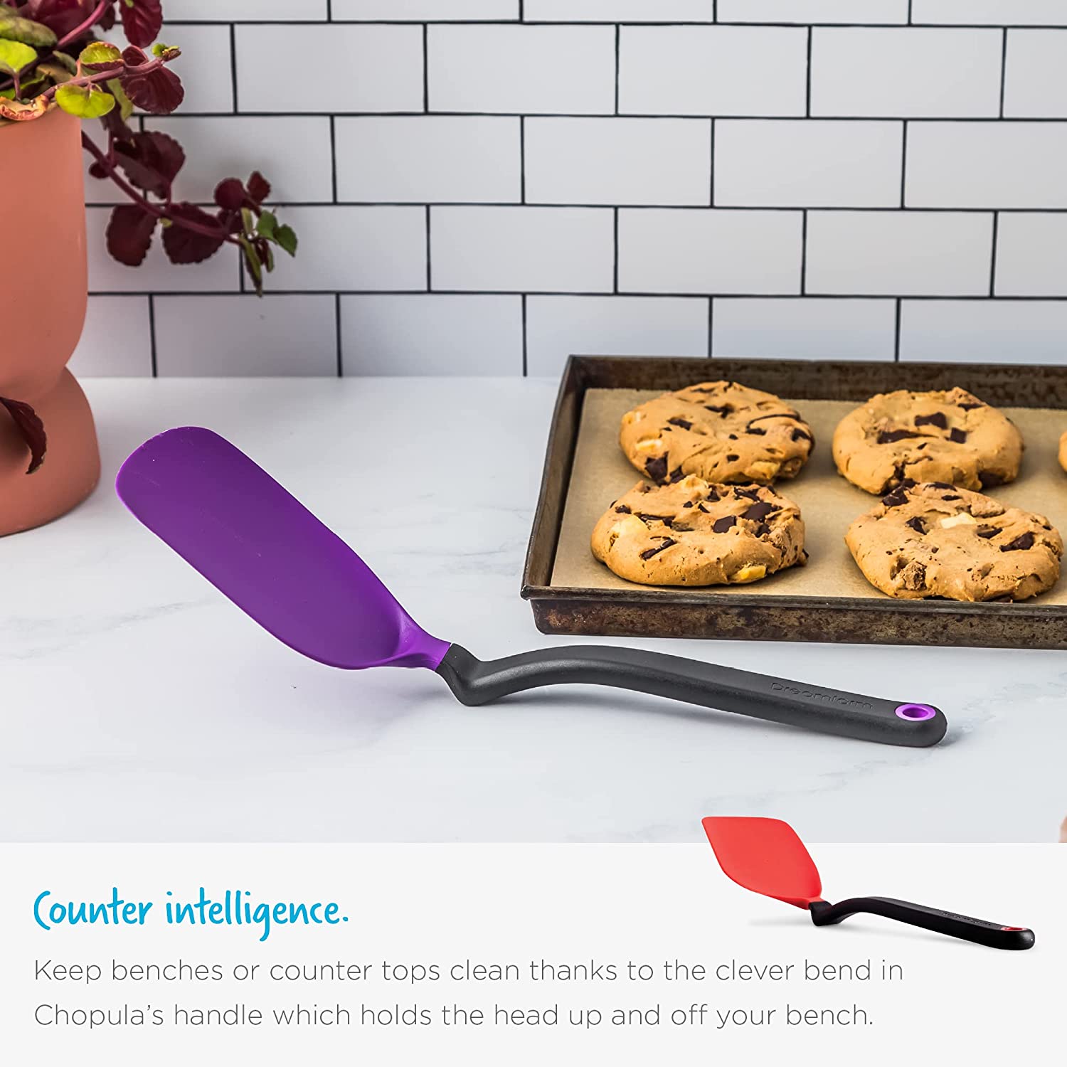 Chopula is an award-winning spatula that is not only thin and flexible for flipping from the front, but also incredibly strong for chopping on its side. Great for separating minced meat or eggs in a pan, flipping pancakes and serving. Chopula’s clever handle design also lifts its head up off your kitchen bench when you put it down.