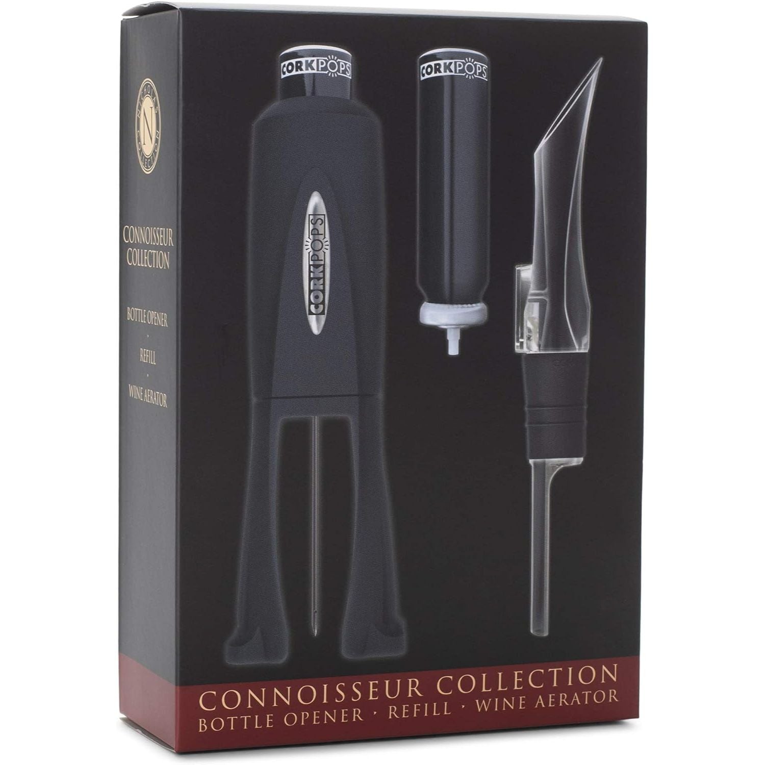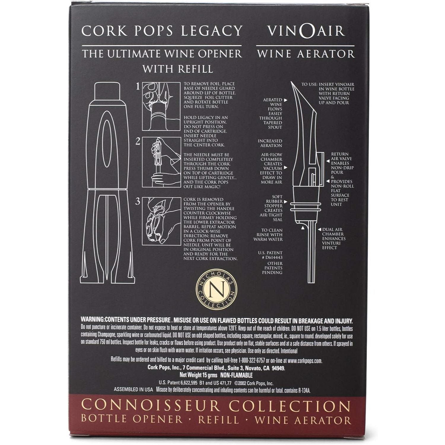 - Cork Pops Connoisseur Collection includes both the VinOair Wine Aerator With the patented non-drip pour spout and the best-selliing Legacy Wine Bottle Opener with 4-Blade foil cutter