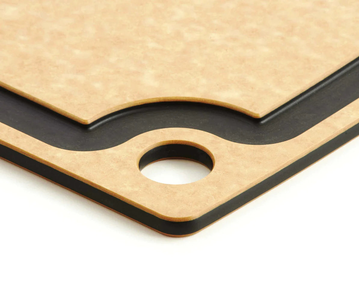 The robust Gourmet Series Cutting Board features a thick profile, accommodating a juice groove on one side to contain liquids and maintain clean countertops. On the flip side, an expansive prep area provides ample space for culinary activities, while its dual-tone design brings a touch of simple sophistication to your kitchen space.