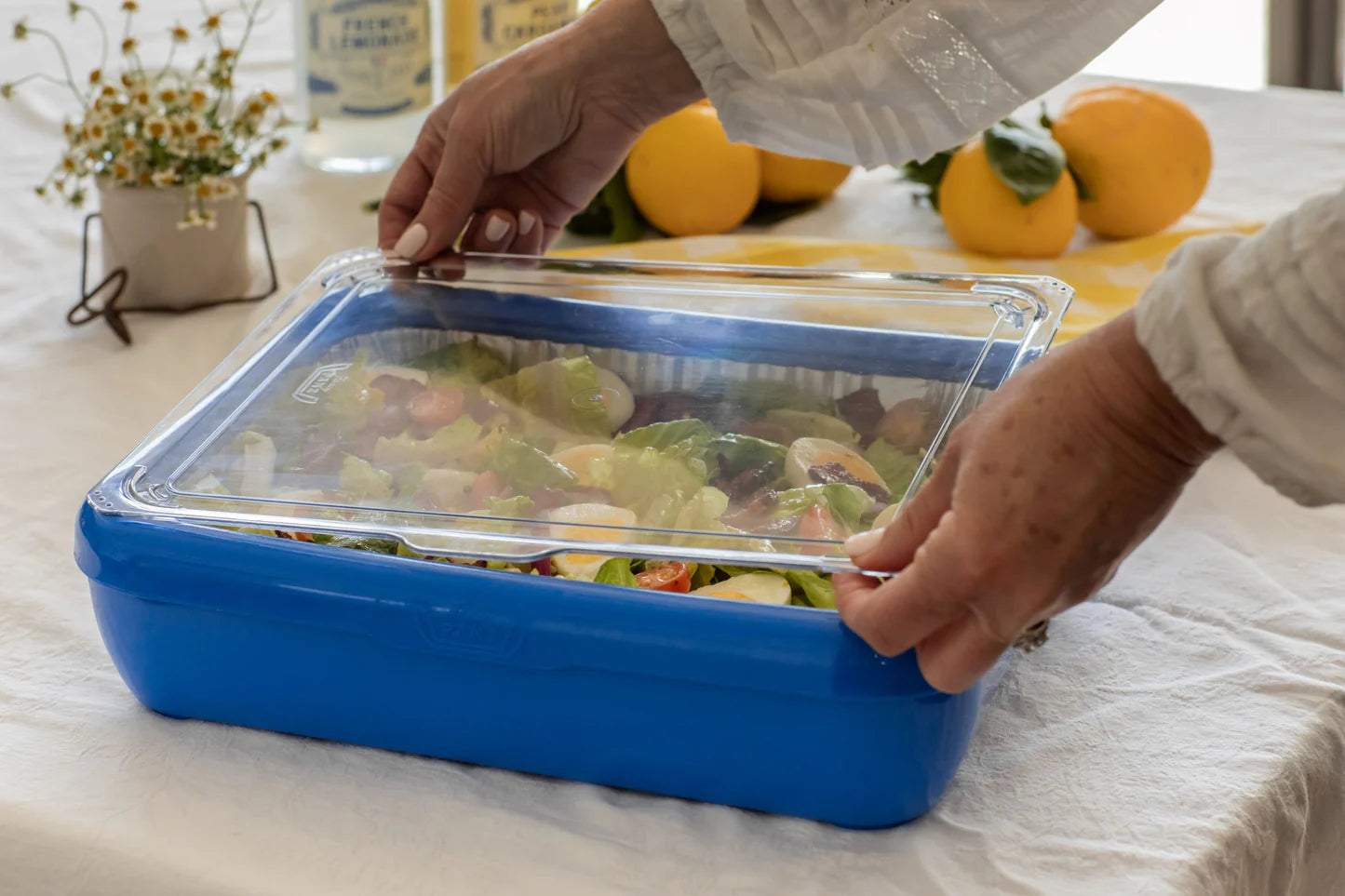 Designed for versatility, the ribbed bottom promotes airflow to help maintain your food's temperature, whether hot or cold. When it's time to serve, just remove the clear cover and place it underneath the Fancy Panz to use as a trivet. If you're leaving the event early, you can easily leave the foil pan behind or dispose of it, avoiding the hassle of transporting dirty dishes or losing a favorite serving piece.