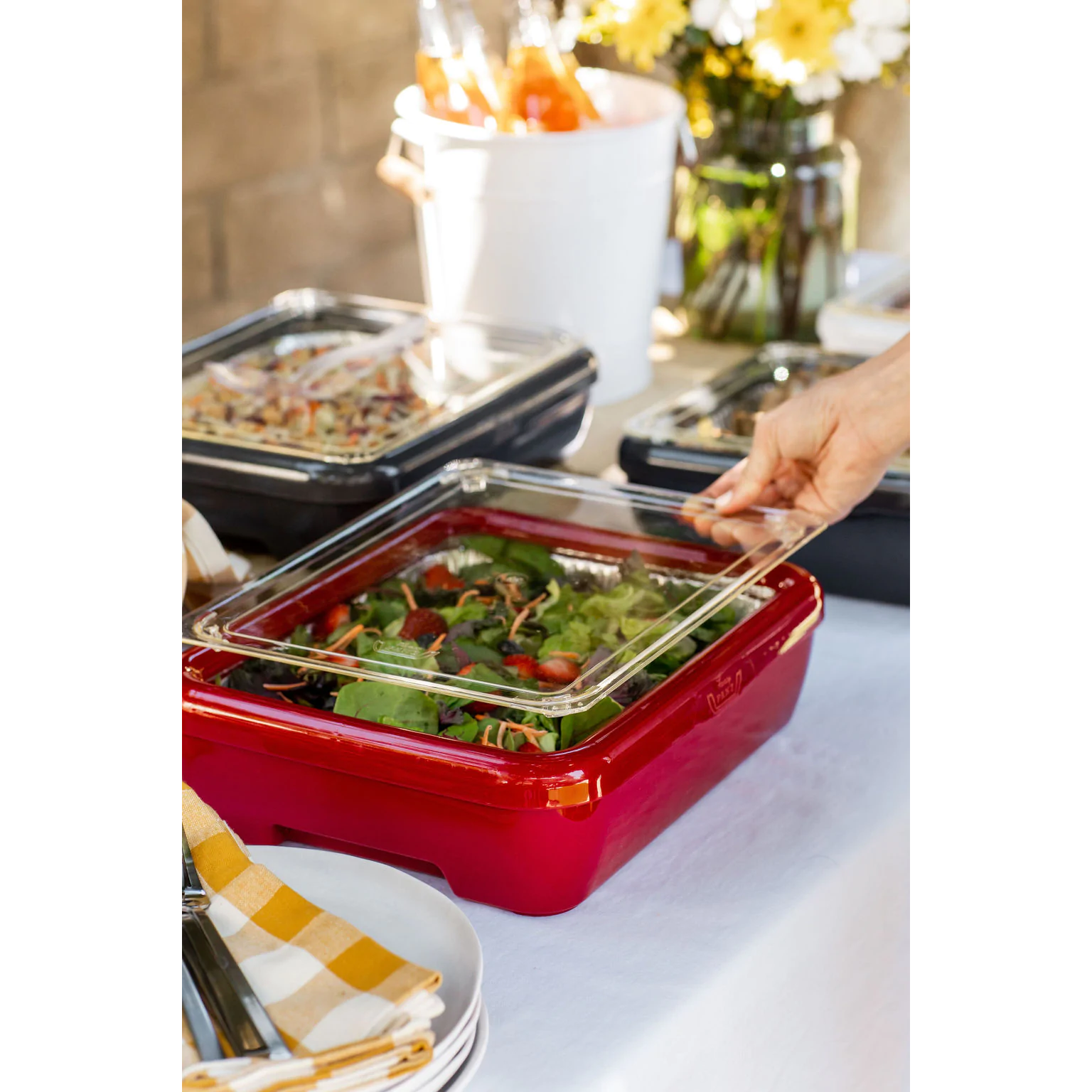 Take hot or cold food to your next event in a foil pan placed in a decorative Fancy Panz. The ribbed bottom is designed for air flow to help maintain food temperature. When it's time to serve, remove the clear cover and place it under your Fancy Panz where it now becomes a trivet! Leaving the party early? Simply remove the foil pan and leave your food at the event or dispose of the foil pan. No more dirty dishes to bring home and NO MORE LOST SERVING DISHES!