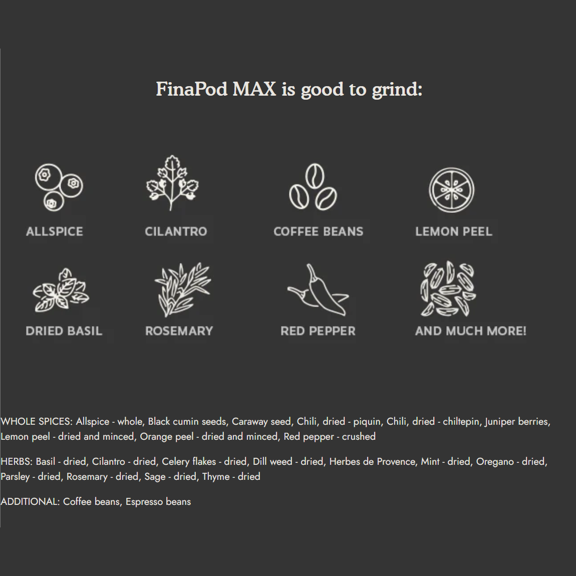 - 1 FinaPod Max: Dried Herbs and Whole Spices