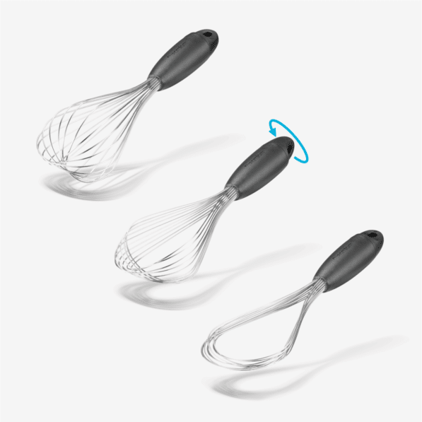 Flisk twists to create 3 whisks from 1 – a large balloon whisk for whipping, a sauce whisk for shallow liquids, and a flat whisk for deglazing.