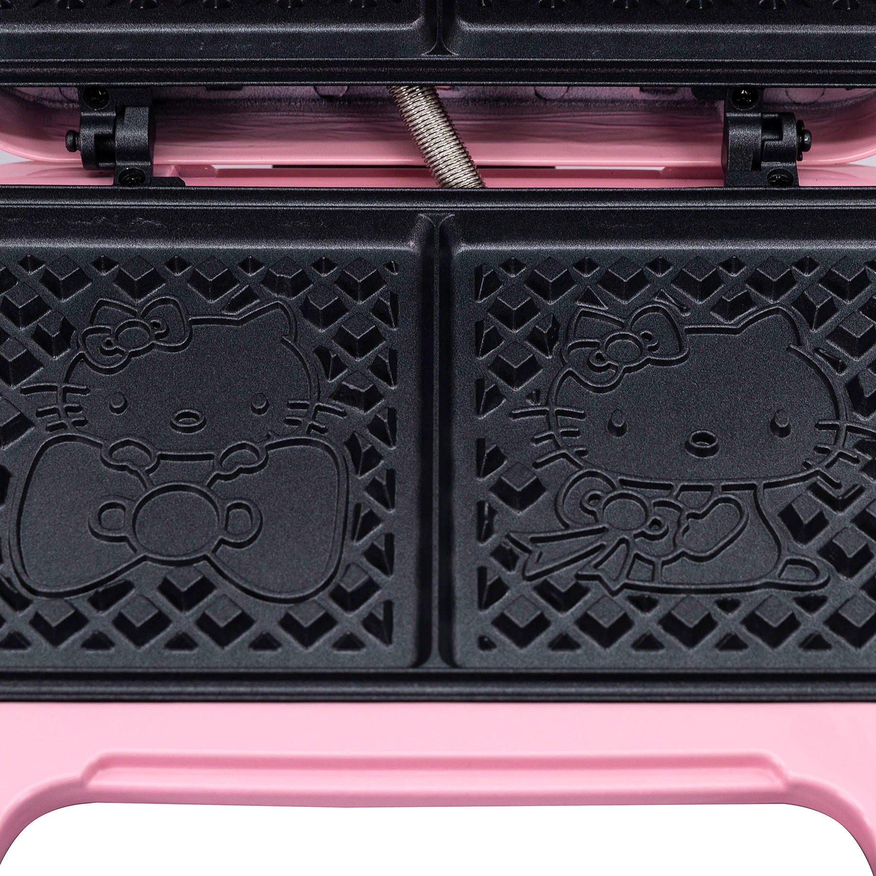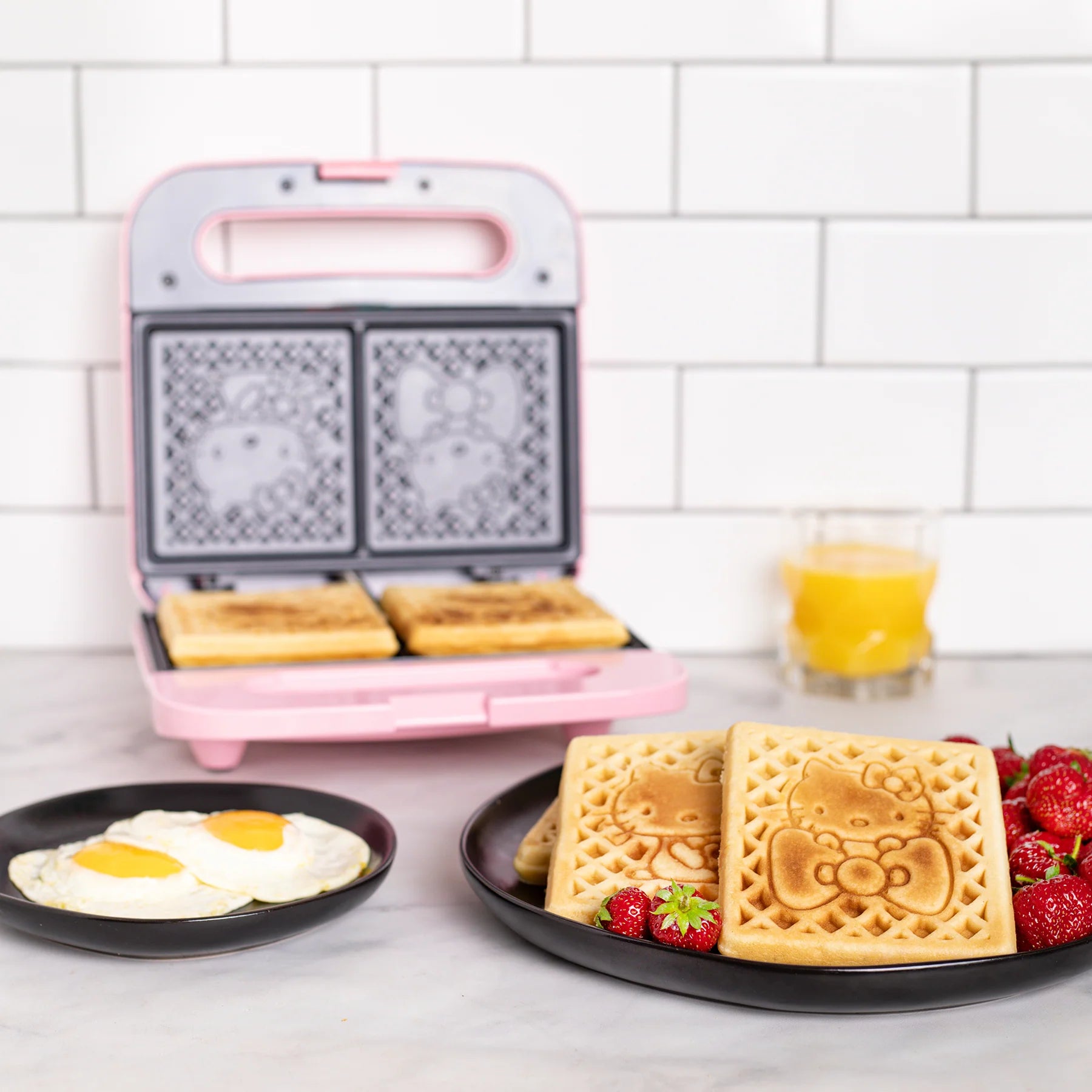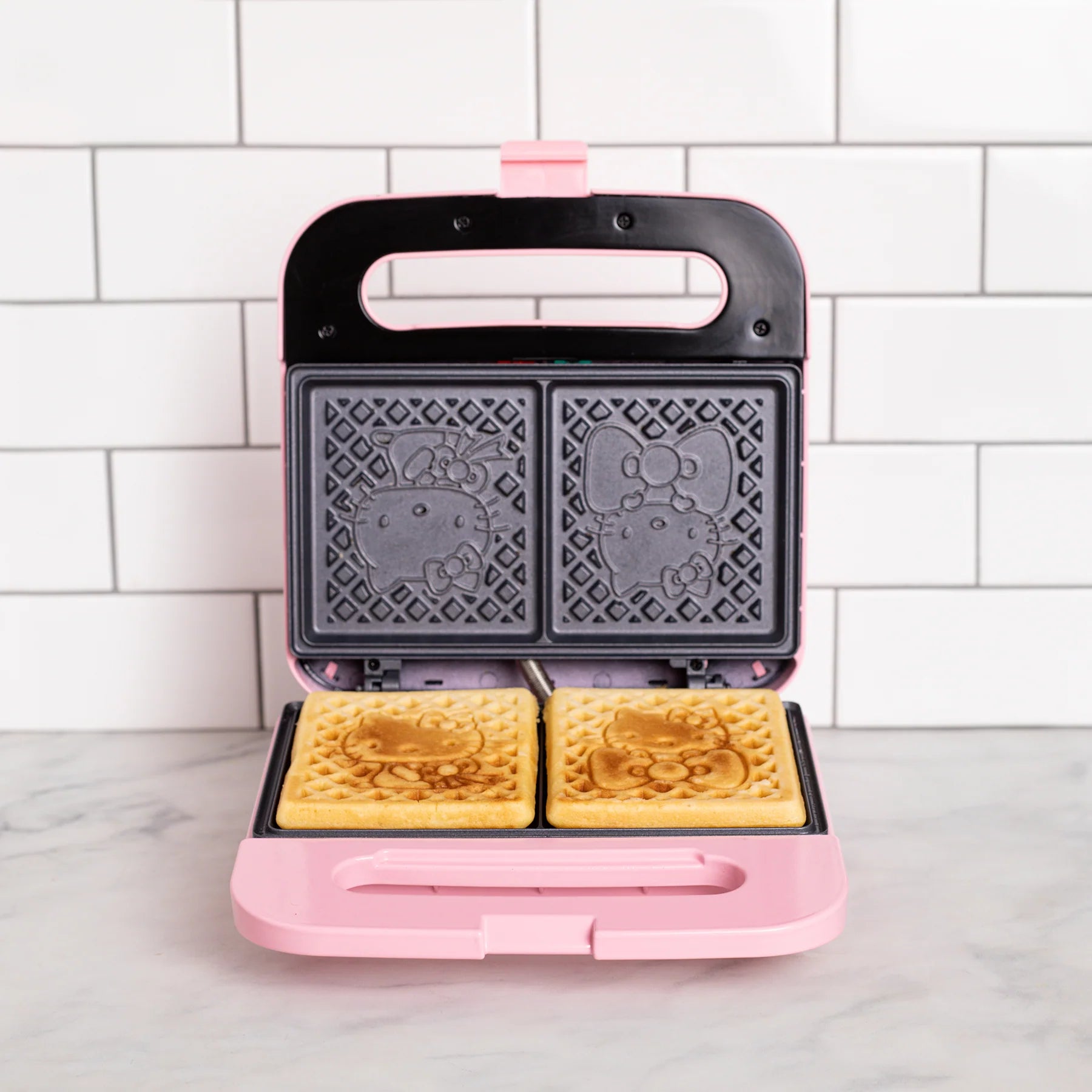 - HELLO KITTY WAFFLE MAKER – Make Hello Kitty waffles at home. Pour in the batter, lower the lid, and before you know it, there are two waffles, both highlighting Hello Kitty, ready for butter and syrup.
