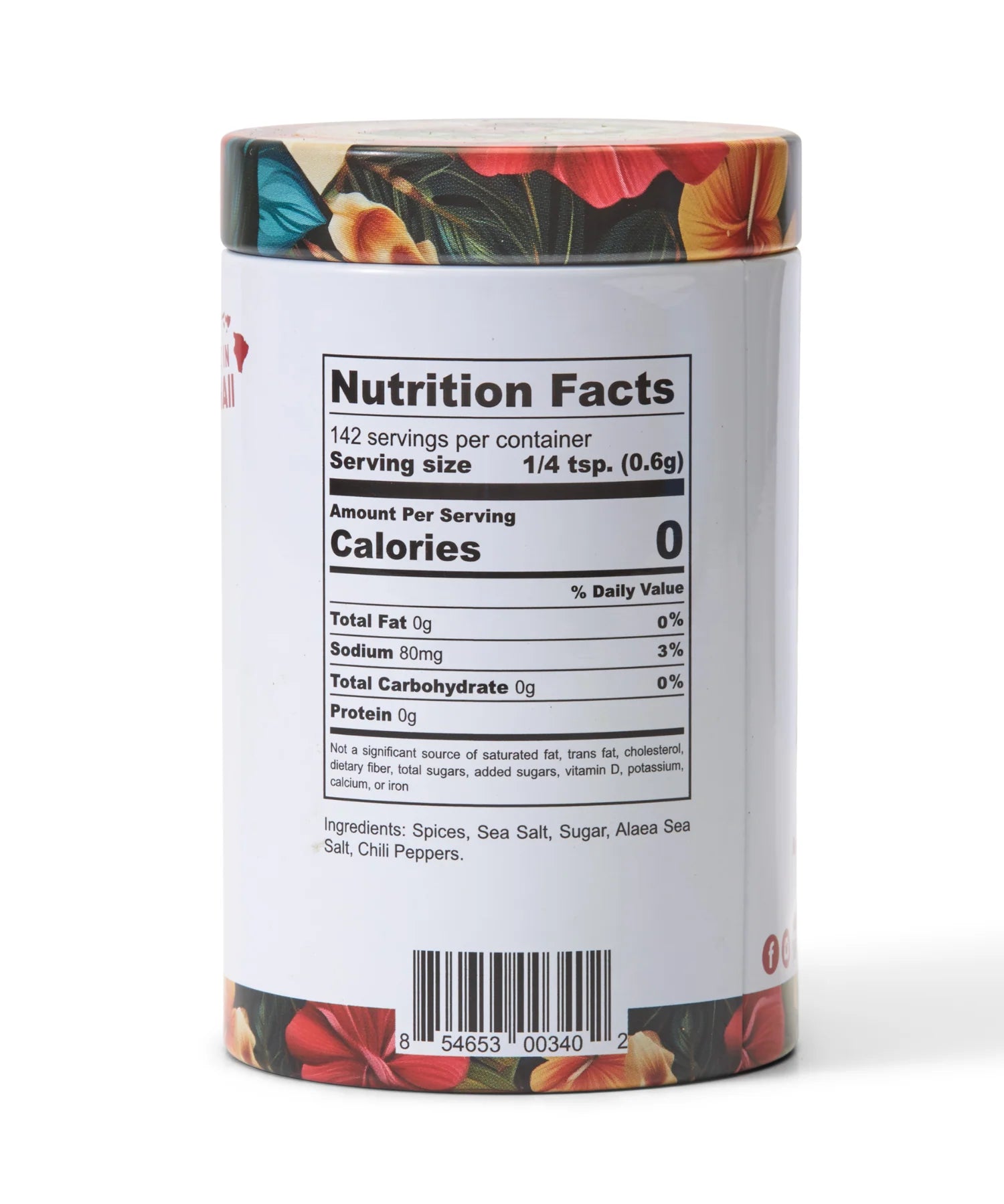 Spices, Sea Salt, Sugar, Alaea Sea Salt, Chili Peppers.