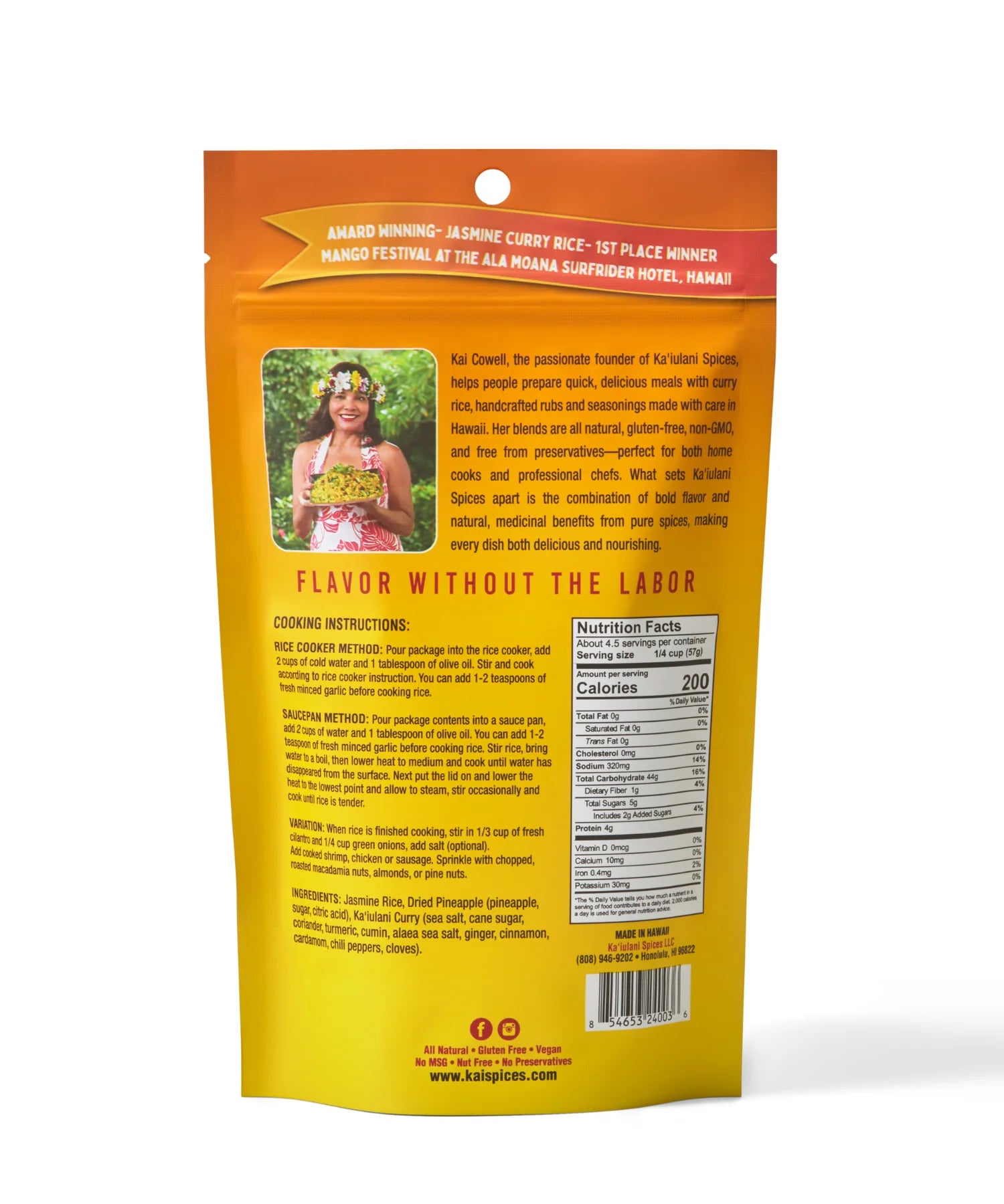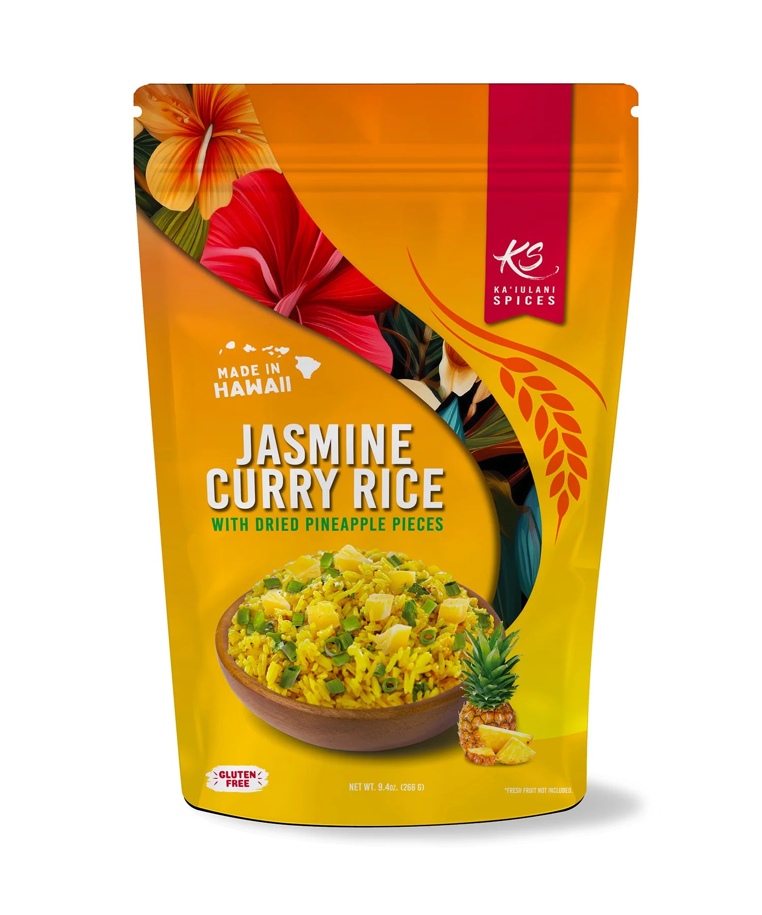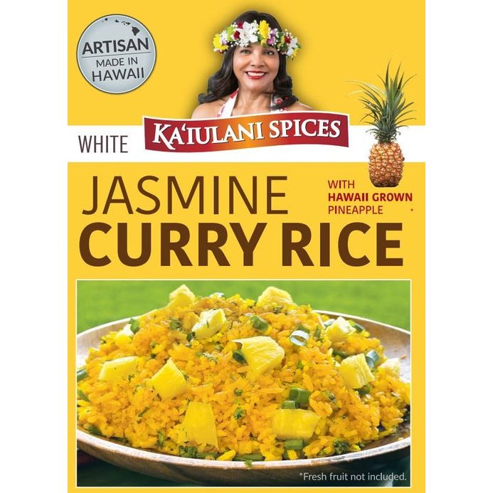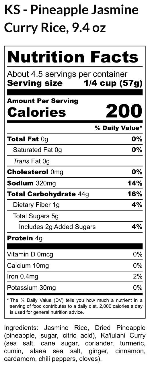 Jasmine Rice, Dried Pineapple (pineapple, sugar, citric acid), Ka‘iulani Curry (sea salt, cane sugar, coriander, turmeric, cumin, alaea sea salt, ginger, cinnamon, cardamom, chili peppers, cloves).