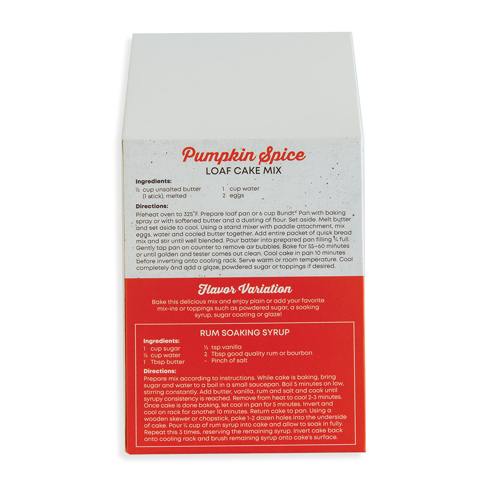 The Pumpkin Spice Loaf Cake Mix bakes a delicious Fall pumpkin bread/cake that is moist and full of warm cozy spices. Bake in any of our cast aluminum Fall Loaf Pans to add extra detail or bake in a simple everyday loaf pan. Just add butter, water (or milk!) and eggs. Full recipes and ingredients provided on the back of the box along with a topping variation.