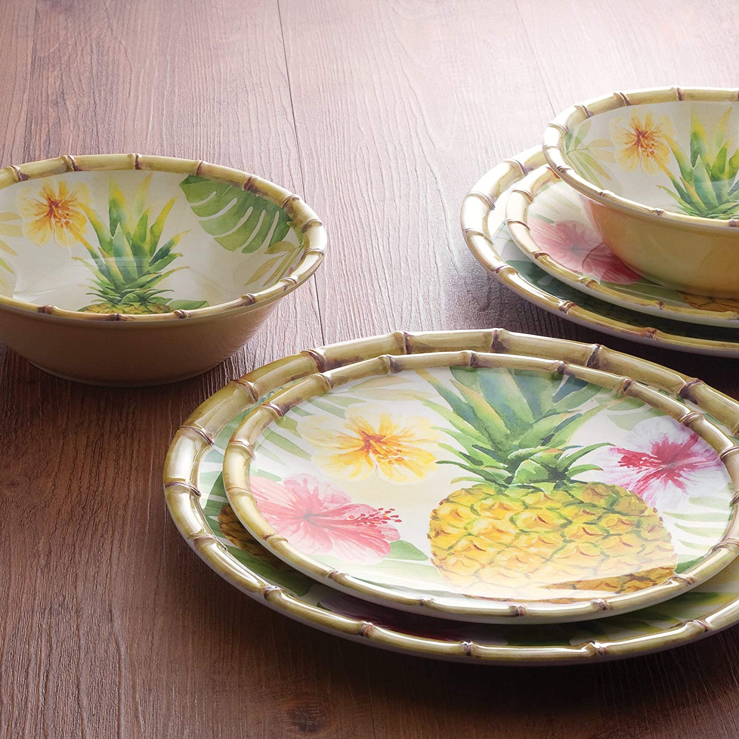 Pineapple themed with a sculptural bamboo rim lends an elevated look to this collection. And its classic style works well with a variety of table settings, whether casual or more festive. This dinnerware is perfect for all your indoor or outdoor entertaining. Made of exceptionally durable, BPA-free melamine.