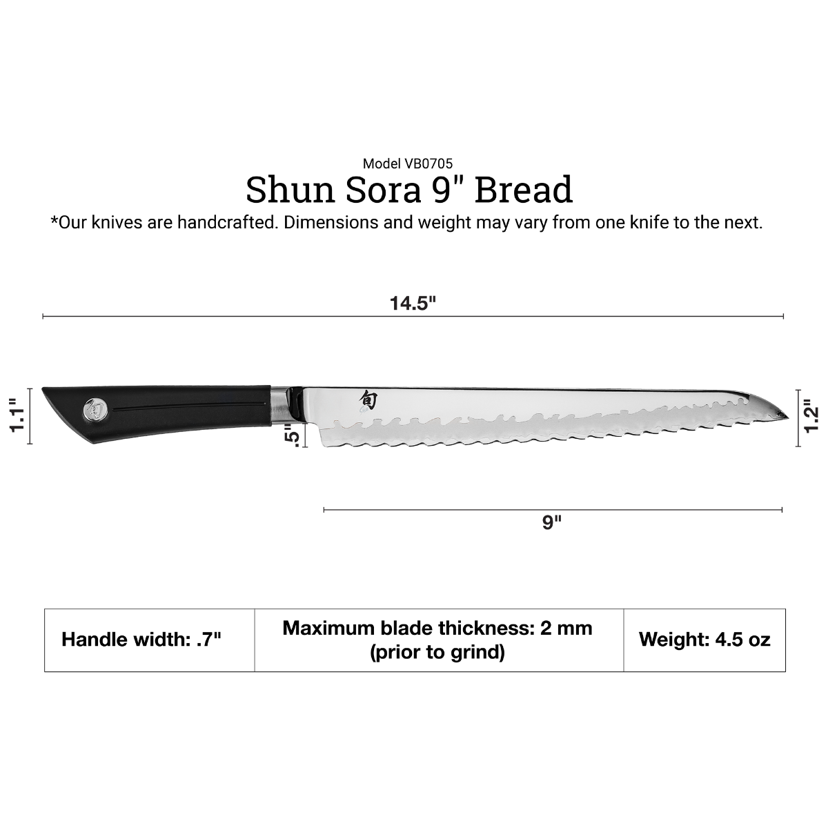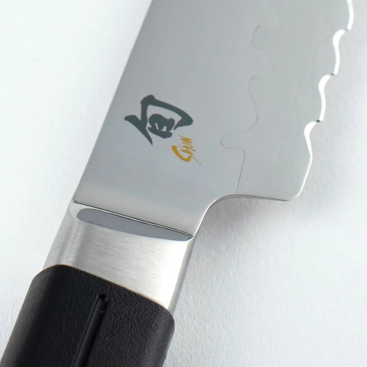 What makes this bread knife special—and better—is the way Shun has crafted the serrations. These are not jagged little teeth that chew through your bread. These are razor-sharp, wide serrations. These wider serrations glide through the bread with ease. Cutting is even smoother because Shun designed the serrations so there's an equal amount of cutting power on the forward and back strokes. Look at the blade and you can see that the serrations lean forward on the front of the blade and backward on the back of the blade. That small change makes a big difference in cutting ease.