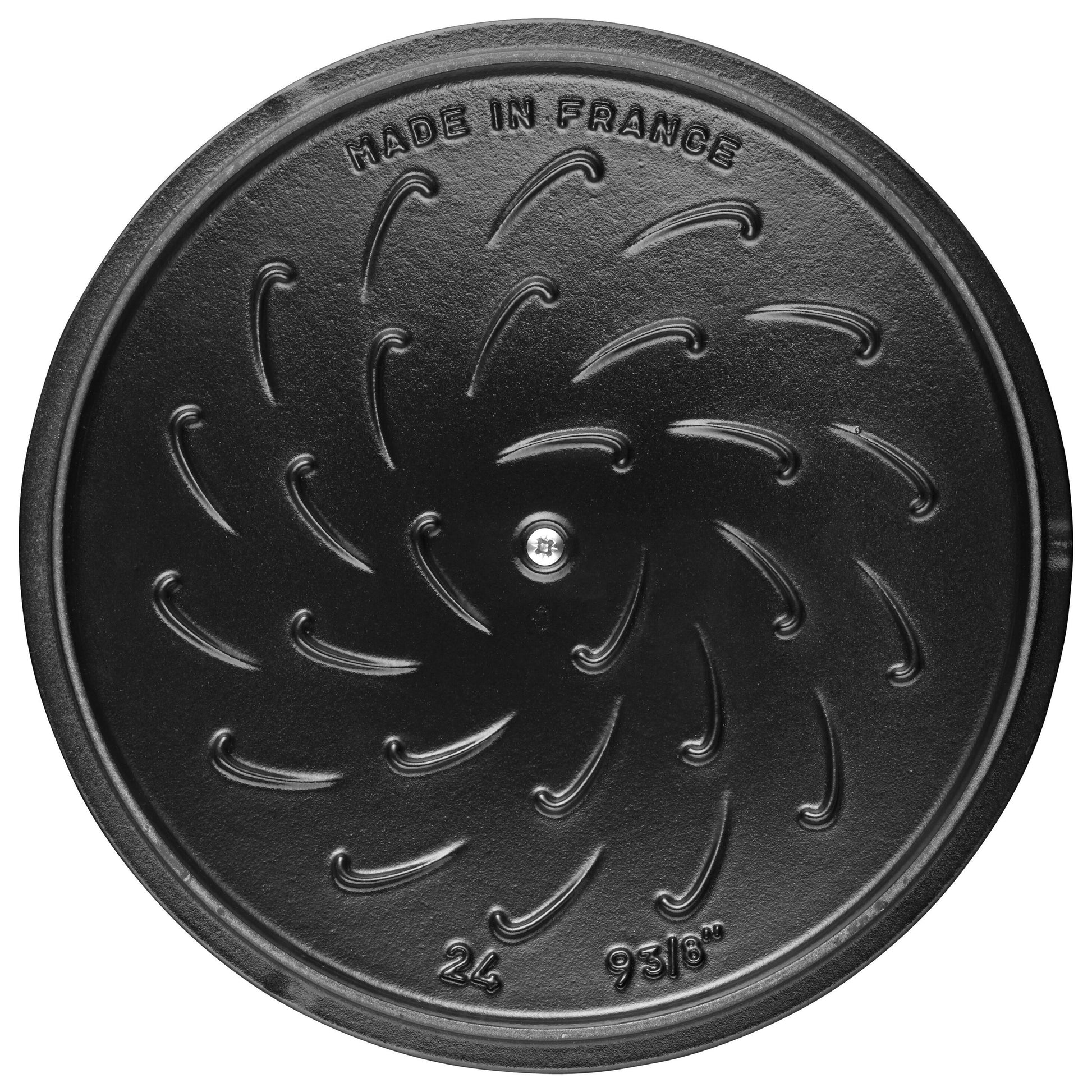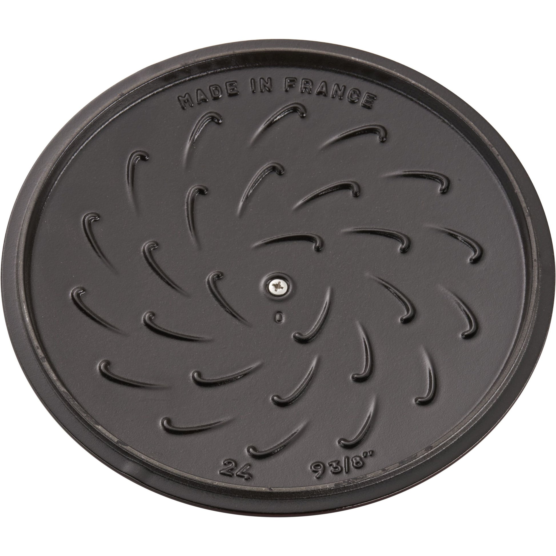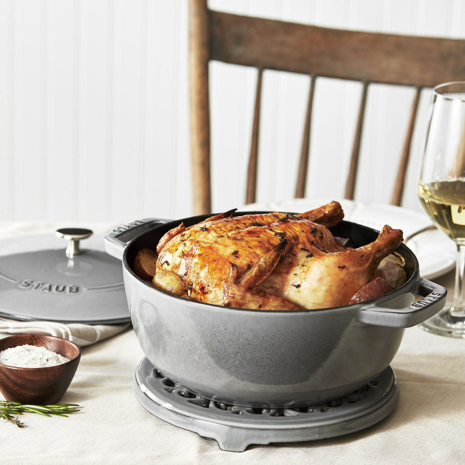 Staub enameled cast iron cookware is the top choice for chefs and home cooks alike. Rooted in French culinary heritage, Staub's renowned cocottes are timeless pieces, perfect for casual meals or sumptuous suppers. The Essential French Oven with Chistera lid is the latest star in the cast iron collection. Like Staub's signature flat lid, the domed Chistera lid has excellent self-basting properties. Usually, a convex lid causes condensation to fall to the sides. The innovative, Chistera drop-structure lid solves this problem by putting a twist on traditional spikes. Moisture cascades from the whole lid. This continuous basting guarantees delectable roast chicken and braised short ribs. What inspired this original design? Basque pelota players use wicker basket chisteras to scoop up balls and hurl them quickly. Under Staub's new lids, the chistera-shaped curves gather condensation to shower moisture upon the delicious dish that simmers inside.