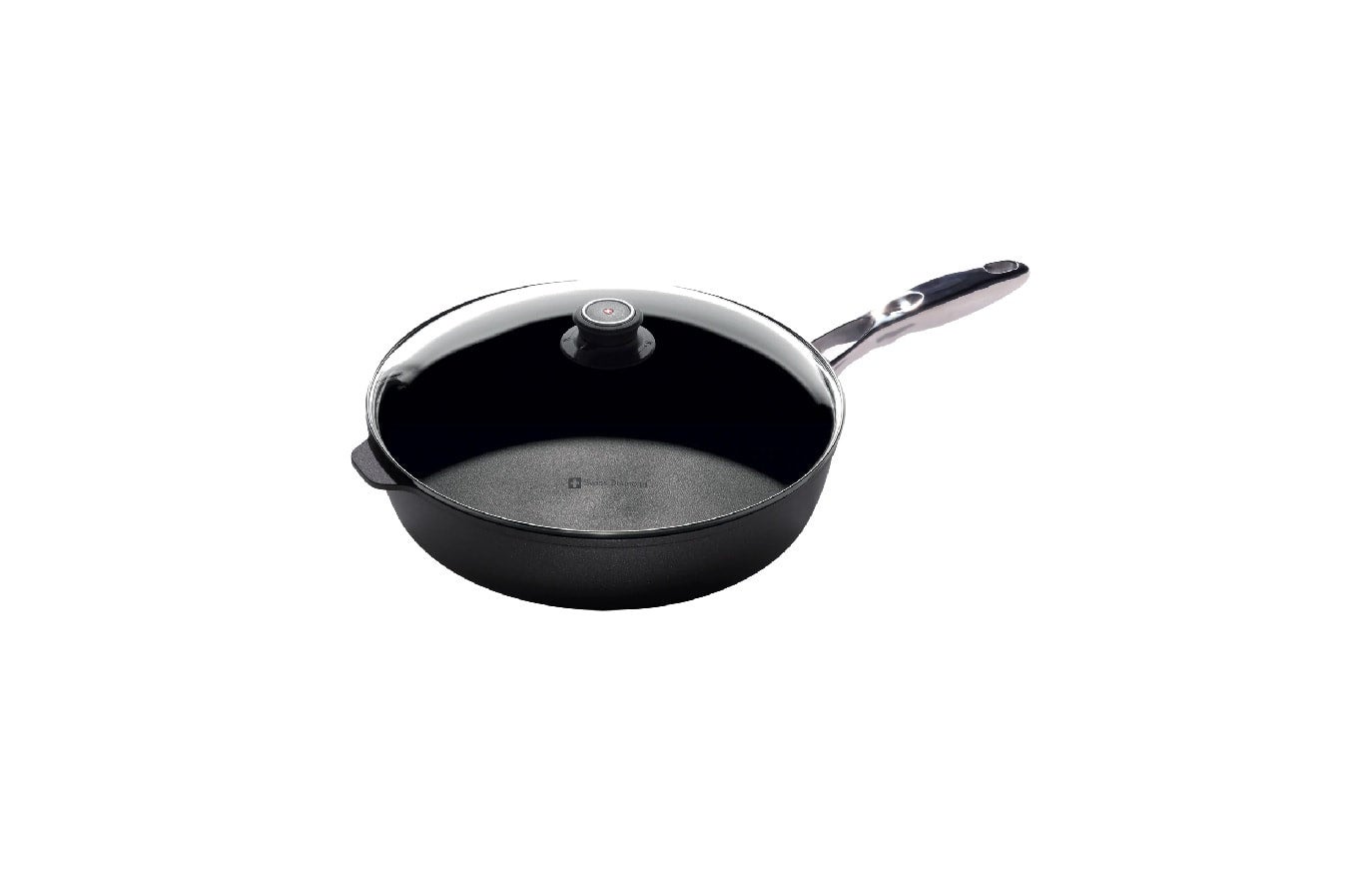 Use the heat-tempered glass lid to let your flavor infuse as the ingredients simmer. The knob features a knob with an adjustable steam vent, providing you with superior moisture control. The ergonomic stainless steel handle is securely attached without rivets and designed to provide maximum stability and maneuverability in the kitchen. The new XD coating provides years of quality, trouble-free cooking. Not only are there 20 percent more diamonds than before, the seal between the cooking surface and the aluminum base is improved, creating a more corrosive resistant layer. Looking to cook healthier meals for you and your family? The XD coating is designed to be used without oil or butter, stripping away excess calories with every dish you make. This large Sauté Pan is the only sauté pan you’ll ever need – or want to use! Made in Switzerland.