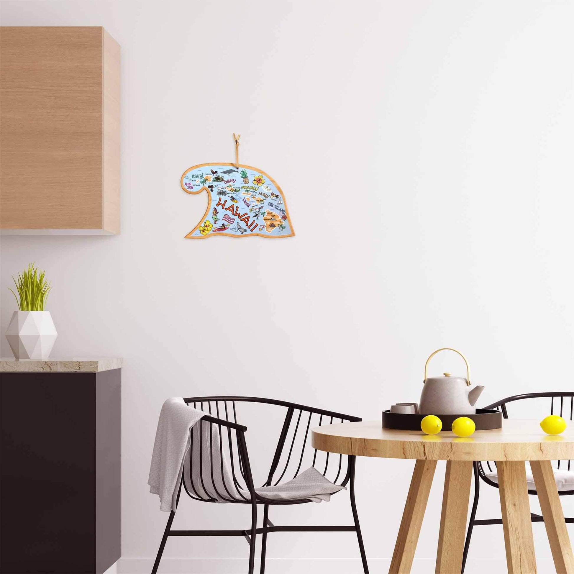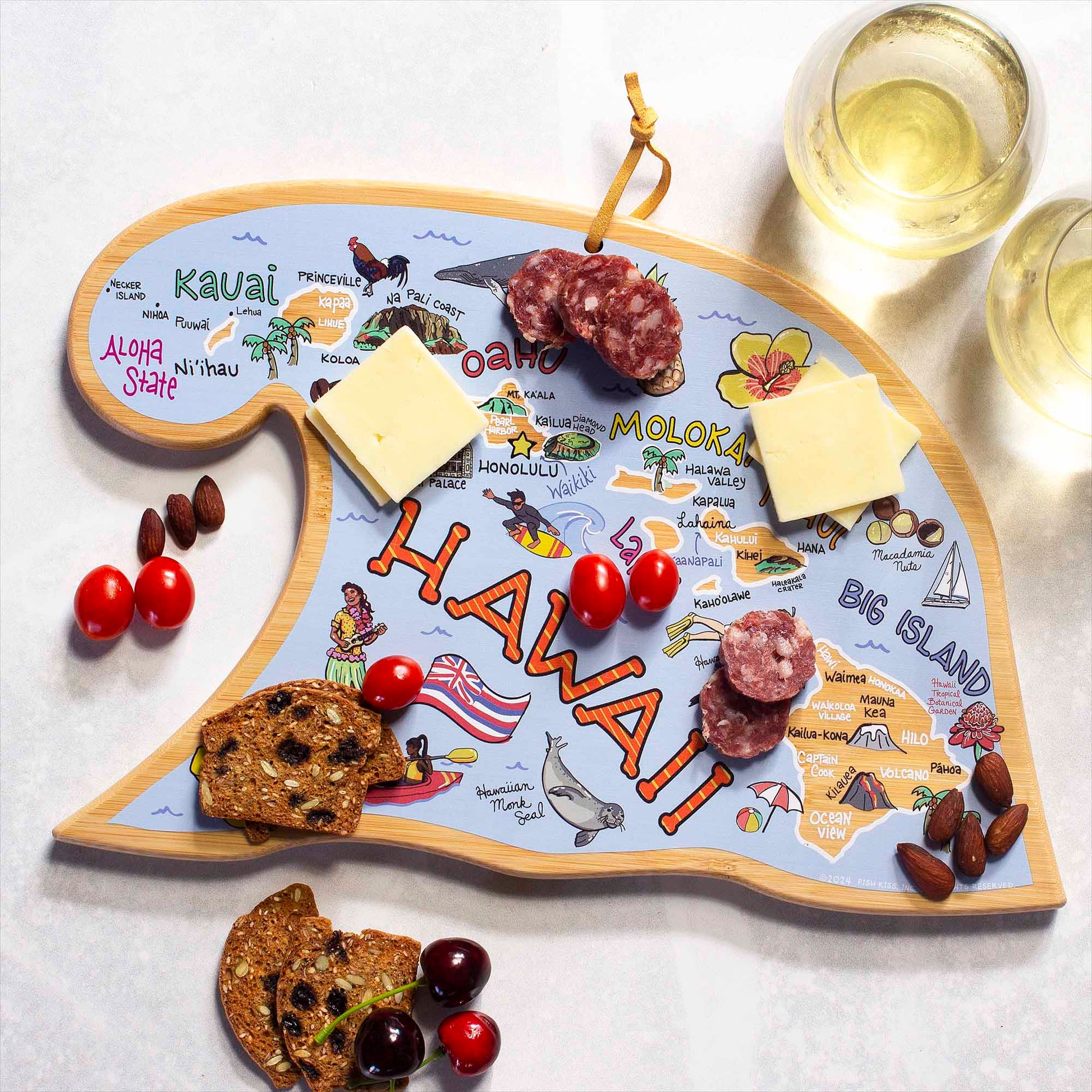 Uncover your favorite places with every bite with our State Shaped Cutting and Serving Boards with Artwork by Fish Kiss™! Beautifully crafted to the shape of a wave, each board showcases the hand drawn artwork of Fish Kiss™ artist Anne Klein. The artwork is applied using specialized UV printing that’s food-safe and will keep its vibrant color. These conversation-starting cutting boards are perfect for serving charcuterie that will have you and your guests reminiscing on your favorite places. Flip the board over to its blank side for a knife-friendly, bamboo cutting surface so you can prep and serve all in one. When not in use, the included hang tie allows it to double as wall art. Show off your love of the state in the kitchen, den or living room. They also make great gifts!