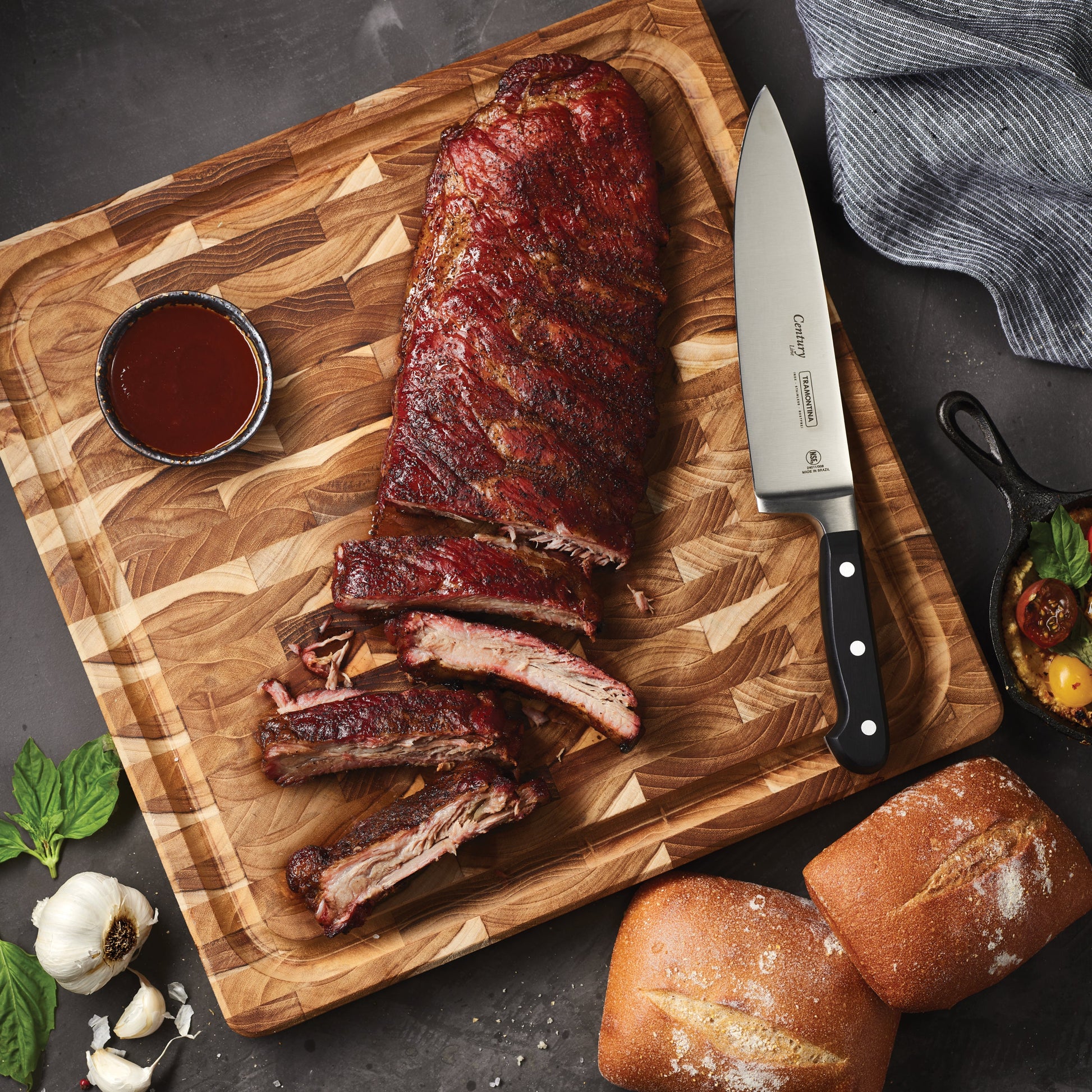 You'll notice Tramontina's Teak Wood End-Grain Chopping Board thanks to its distinctive pattern. You'll love the chopping board - favored by cooking enthusiasts, because it requires little to no maintenance. End-grain chopping boards are made from the short pieces of lumber - in our case, durable, authentic Brazilian teak wood - that are grafted together vertically with the end pieces making up the surface. The look is as eye-catching as it is functional. The board's dense surface also makes it more stable during use - while its carved out groove along the edge catches juice or liquid so it won't spill over the side.