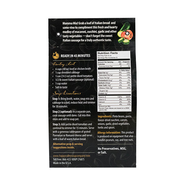 This classic soup is a staple of traditional Italian cuisine. Our unique blend of freeze-dried zucchini, pinto beans, carrots, pasta and spices captures that Italian tradition. Add crushed tomatoes, cabbage and sausage to make this classic zuppa!