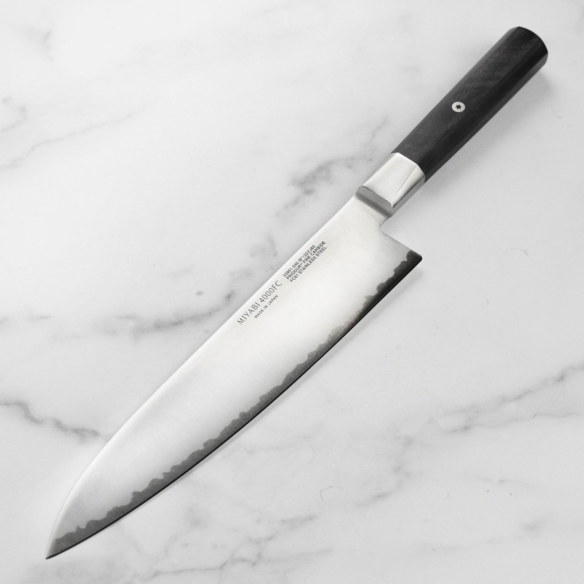 - Mirror-polished blade features Japanese design details: sandblasted katana edge and embossed MIYABI logo