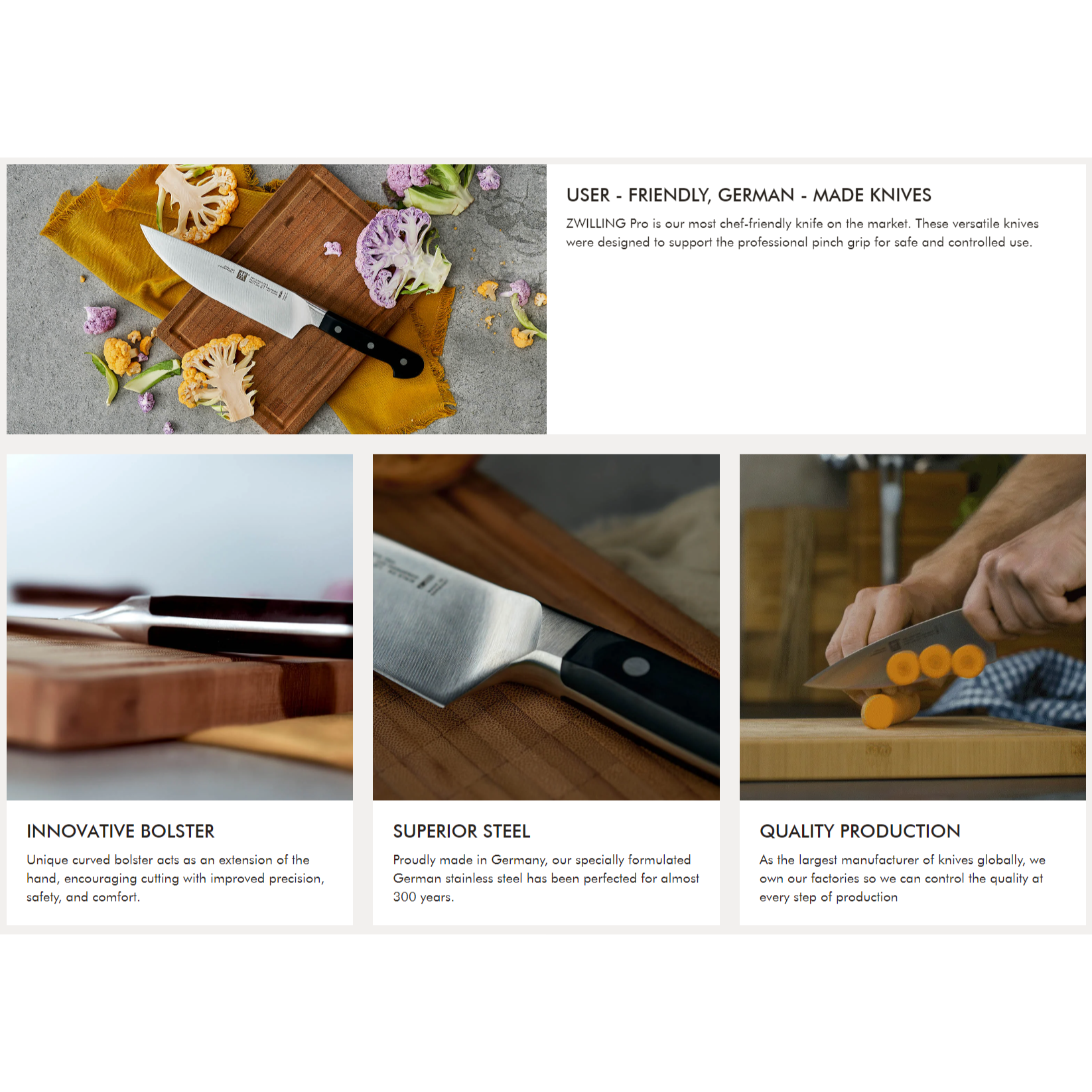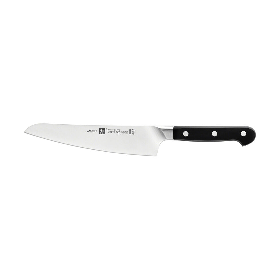 ZWILLING Pro boasts a unique curved bolster that acts as an extension of the hand, supporting the professional pinch grip, with thumb and index finger on the blade, for safe cutting and less fatigue. The blade was designed with a broad curve in the front to facilitate the rocking motion of Western cutting, while the straight back is ideal for the chopping motion Japanese knives were designed for. The full length of the blade can be used when cutting and can be sharpened from bolster to tip.